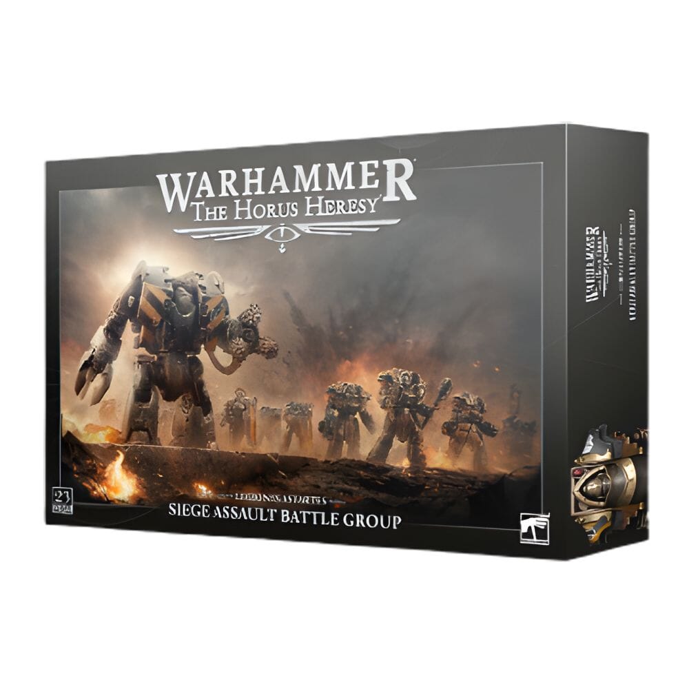 All throughout the Horus Heresy, the Space Marine Legions were required to attack and take down enemy fortifications, frequently built and maintained by their former brothers in arms. The Siege Assault Battle Group brings together 23 miniatures that excel in cracking fortresses and bunkers, and fighting in the remaining rubble.