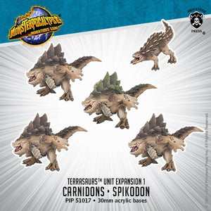 This blister contains Terrasaur units to expand your Protectors force. Carnidons are the frontline melee unit for the faction, able to destroy enemy units and team up to threaten monsters. Spikodons are ranged attackers whose bursts of spikes are capable of destroying multiple units in one shot.