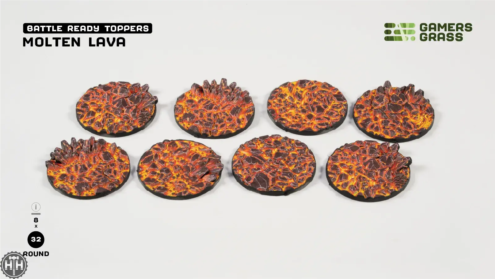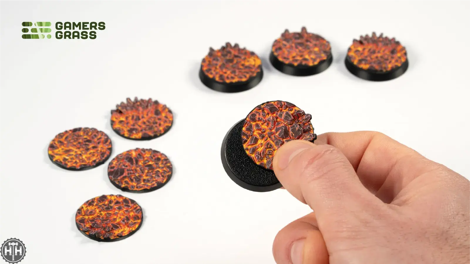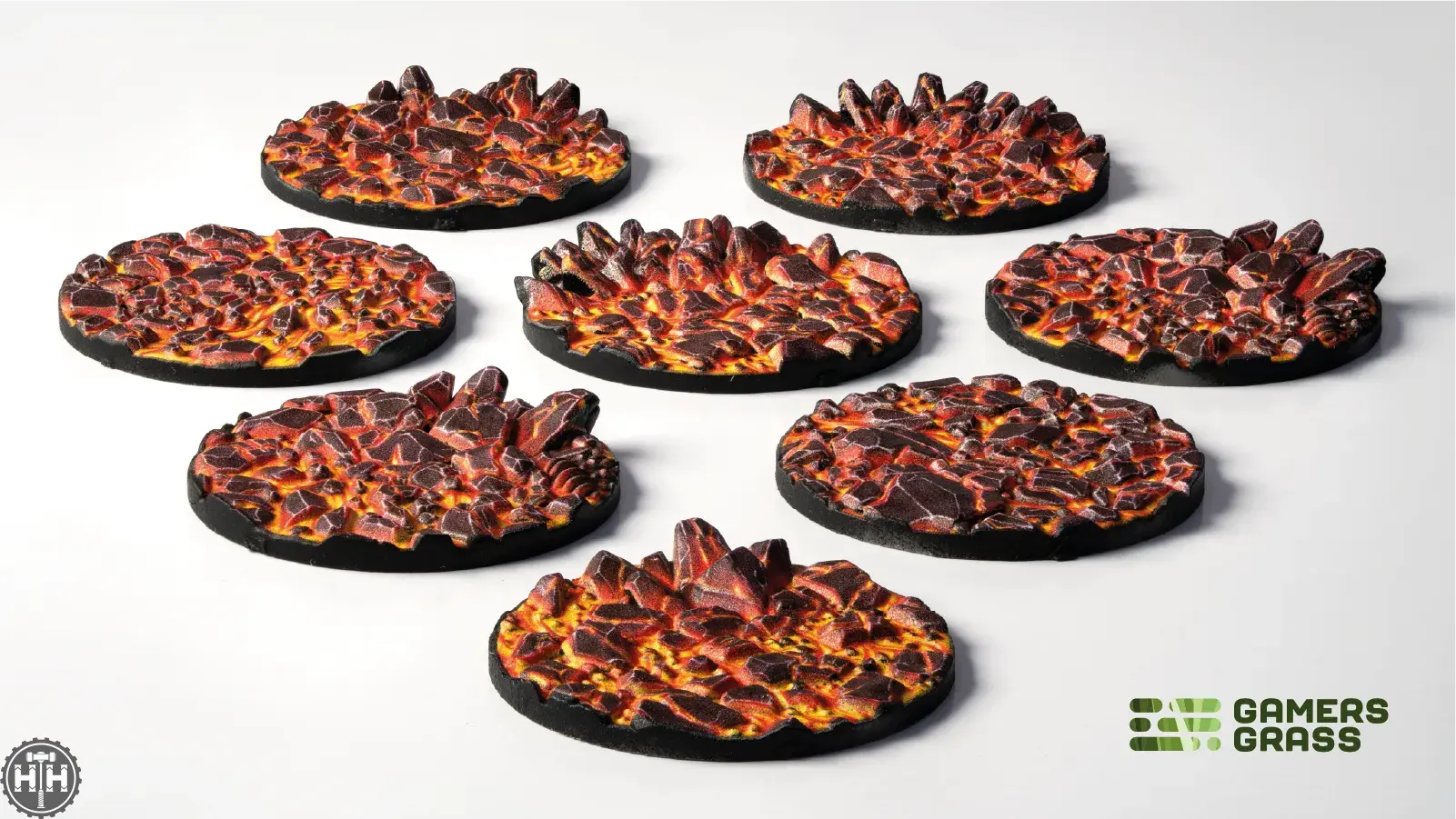 This blister contains 8 thermoplastic toppers made for 32mm round bases, in a Molten Lava theme.