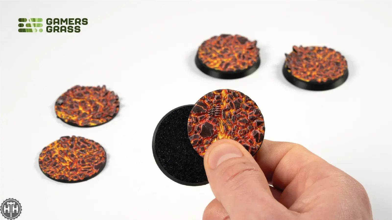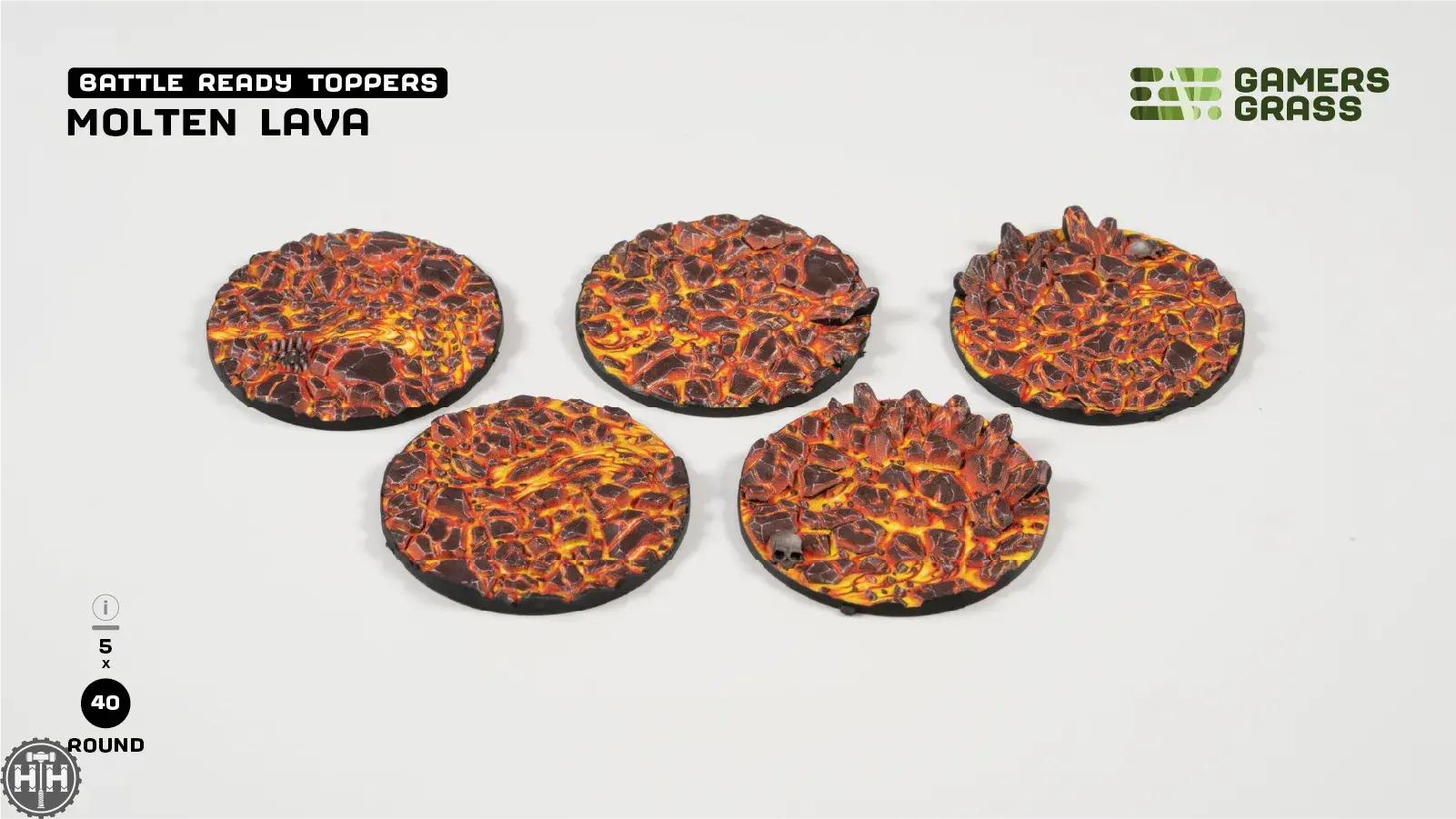 This blister contains 5 thermoplastic toppers made for 40mm round bases, in a Molten Lava theme.
