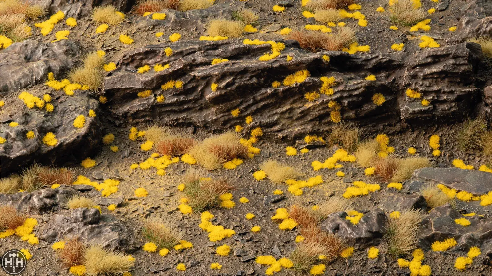 Very small and low tufts with golden yellow tones. Best used to simulate sunlit lichens on rocks, branches, and open terrain. In combination with earthier hues, they provide realistic detail. At very small scales, they are perfect to simulate radiant autumnal grass.
