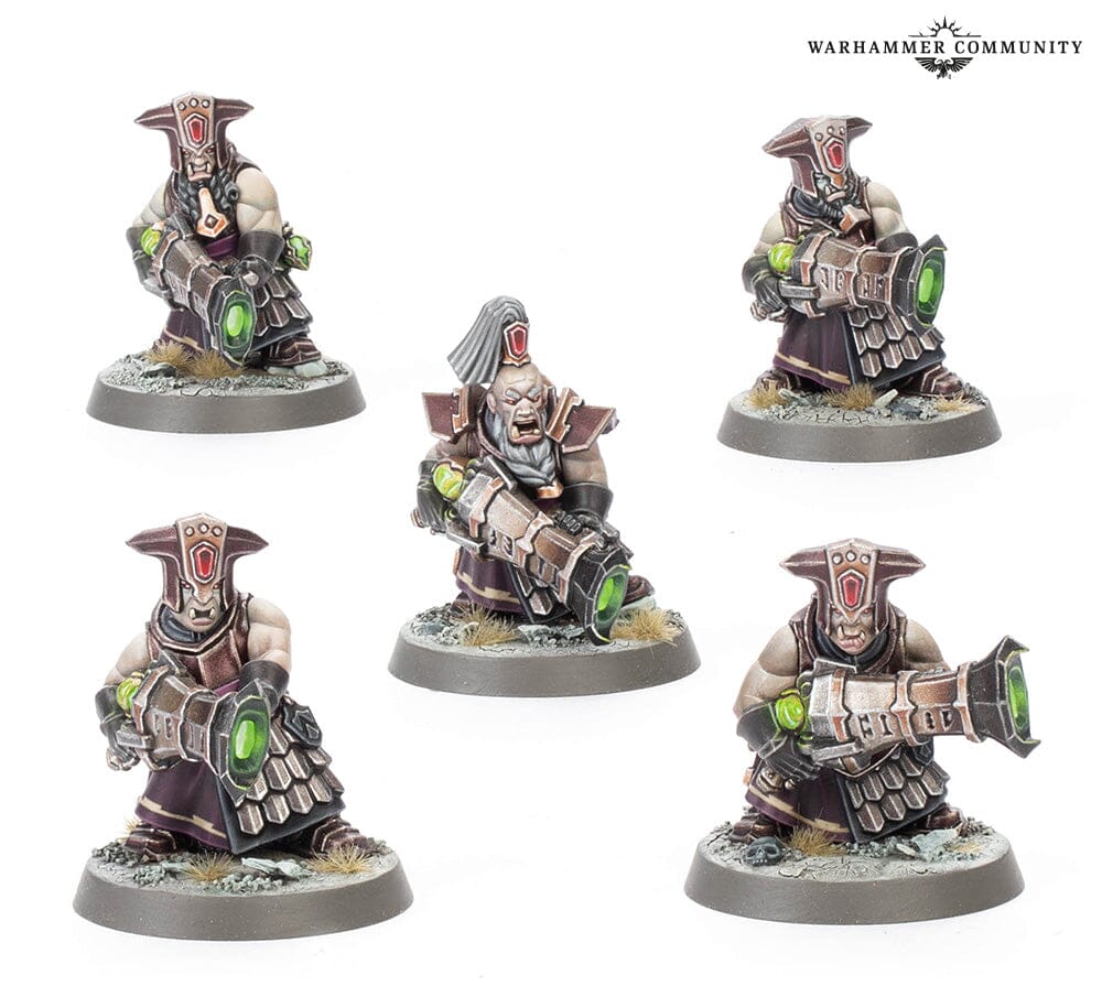 Zharrdron artisans who are capable of making intricate weapons are often recruited into the regiments of the Infernal Razers. Operating in small groups, they wield complex and devastating firearms that unleash destruction from range as their operators cackle spitefully. This box builds five Infernal Razers, each equipped with either Grizmalok Blunderbusses that shred foes with booming shots, or Karagthrun Flamehurlers that roar with torrents of superheated flame. The champion can be built with a choice of two heads.