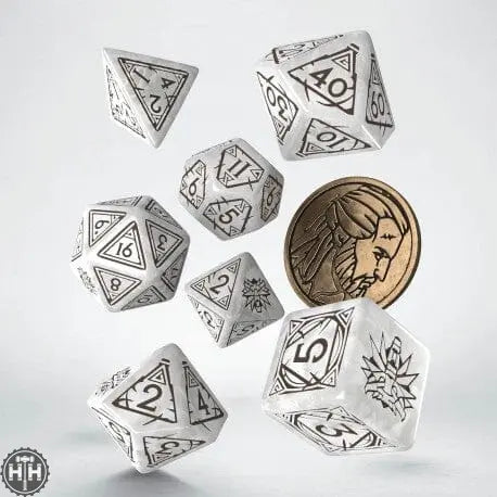- Established reputation — The highest value faces of each die and the coin reverse are adorned with the Wolf School symbol, while the coin obverse presents the side-profile of Geralt.