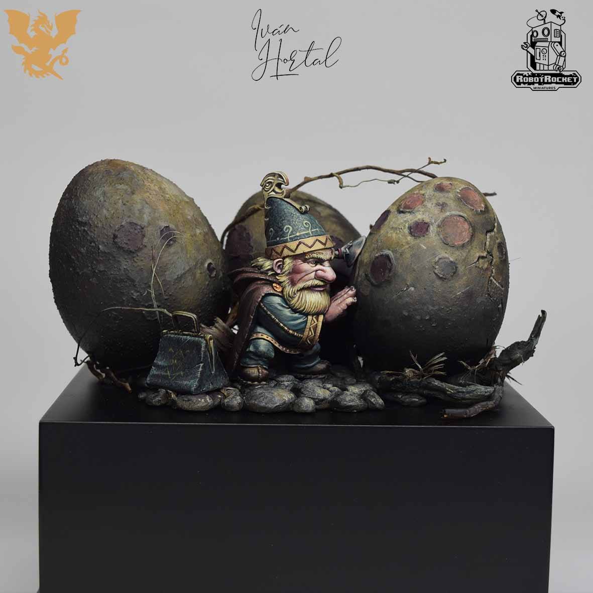 Scale : Dwarf is 53mm tall from bottom of feet to top of hat. Largest egg is 60mm top to bottom.