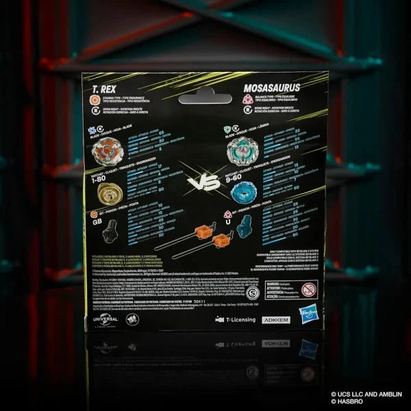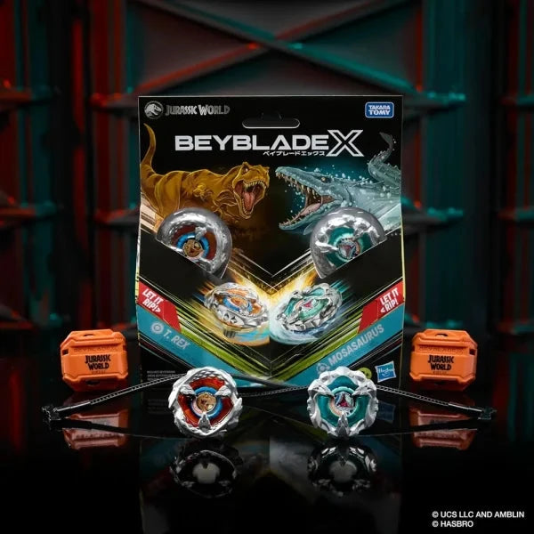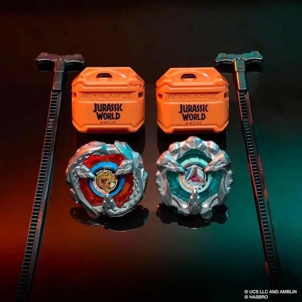 - JURASSIC WORLD BEYBLADE TOPS: 2 powerful dinosaurs battle each other in your Beyblade X Beystadium in this collaboration between Jurassic World and Beyblade X spinning tops